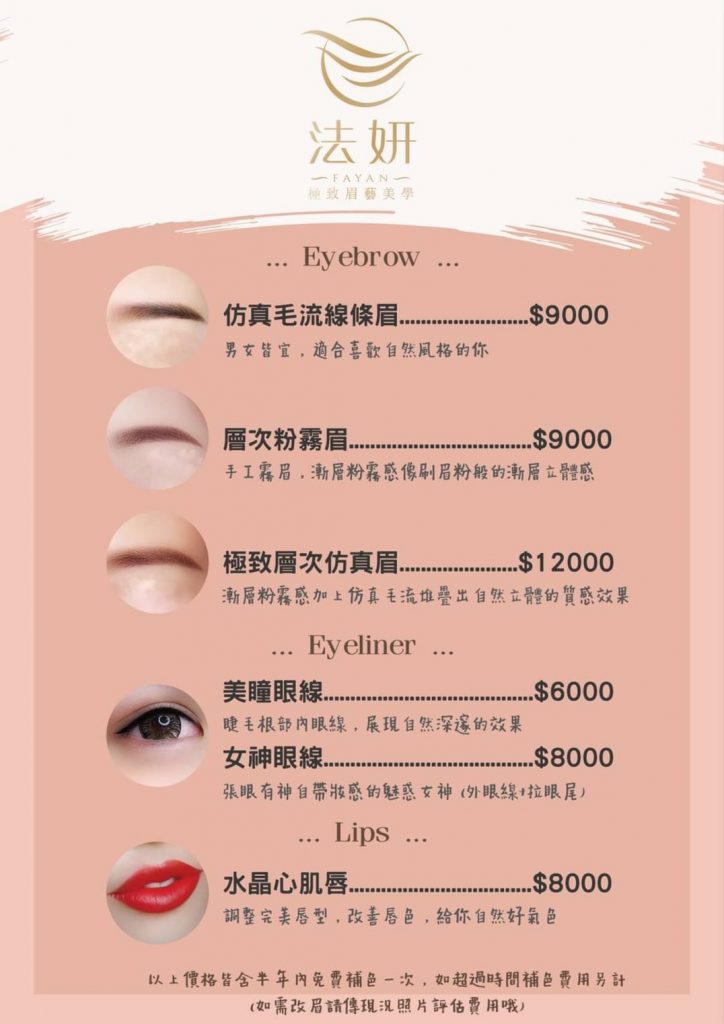 價目表 價目表 & QA問與答 紋繡眉是一種專業及藝術品的展現,讓紋綉後的客人能夠帶著自信與美麗離開店內,法妍絕對做得到。 『優惠價』請私粉專 以上是我們針對不同的服務提供不同的價格,如果你想要擁有更優惠的價格,歡迎私訊粉專詢問。 QA問與答 以下是我們的Q&A針對顧客常見問題回覆 1. 我該如何預約呢?需付訂金? 可以透過私訊法妍粉絲團預約,並且支付訂金$2000元,我們將會幫你預約指定時間。 2. 事前需要準備什麼? 單天可以穿著舒適的衣著,可上淡妝或素顏,保持愉快的心情。 3. 修復期需多久時間呢? 服務結束後,可立即洗臉,無修復期 4. 什麼時間需要補色呢? 施作後約4-5天會脫落薄痂,小助理28天後會貼心提醒你,可回傳目前狀態照片約做補色時間唷!